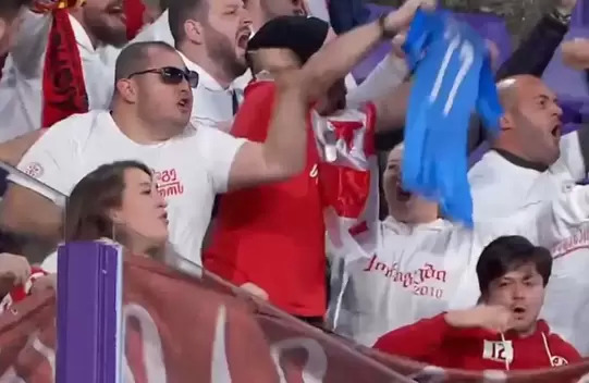 და თავისი სიტყვების დასამტკიცებლად პორტალს მოაქვს ფოტო, რომელზეც ასახულია ქართველ გულშემატკივართა ზეიმი ვალიადოლიდის „ესტადიო ხოსე სორელიას” ტრიბუნაზე კვარაცხელიას მიერ მე-10 წუთზე გატანილი გოლის შემდეგ, სადაც „ნაპოლის” ლურჯი მაისურაა გაშლილი.